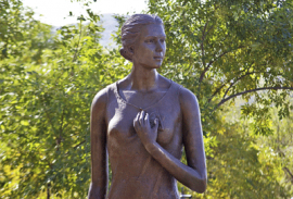 Это уникальный памятник: на высоком крутояре – несколько брёвен, уложенных друг на друга так, что получилась скамейка. А рядом – опирающаяся на символический бревенчатый угол крыша деревенской избы. Около неё большой валун, за ним раздвоенный оструганный ствол сосны, похожий на поднятые к небу девичьи руки. И надпись на металлической планке, прикрепленной к валуну: