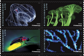 Во второй половине февраля Почтовая служба США (USPS) выпустит серию марок Bioluminescent Life, посвящённых одному из самых уникальных природных эффектов - способности ряда живых организмов светиться в темноте. На буклете из 20 марок будут изображены десять разных светящихся организмов.