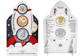 Монетный двор США (USMint) выпустит необычный бокс-сет Glow-In-The-Dark Rocketship для маленьких детей. Он представляет собой картонную ракету с отделениями для трёх монет - классического 50-центовика Джона Кеннеди 2019 года и доллара Мэри Голды Росс - первой американки индейского происхождения, ставшей инженером в космонавтике. Третье пустующее отделение юные коллекционеры должны заполнить самостоятельно любой другой монетой.