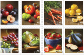 Почтовая служба США (USPS) готовится к выпуску нового буклета из 10 марок под названием "Фрукты и овощи" (Fruits & Vegetables). Главные цели нового релиза - повысить популярность свежих плодов , а также напомнить современному обществу о такой позабытой разновидности живописи, как натюрморт. Все картины, послужившие основой для дизайна марок, принадлежат кисти легендарного пенсильванского художника Роберта Раппа (Robert Rapp).