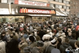 McDonald's очень медленно, но уверено заходил на советский/российский рынок. Открытие ресторанов в регионах уже в 2000-х годах часто сопровождалось драками в очередях и выламыванием дверей беснующимися толпами. Спустя десятилетия жители глубинки вели себя так же, как москвичи в 1990 году. Многие в разговорах ненавидели западную культуру и гордились своим патриотизмом, однако, когда появлялся шанс впервые пообедать в McDonald's - идеологические ценности менялись мгновенно.