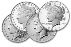 12 сентября Монетный двор США (US Mint) начнёт продажу двух новых монет из серебра - Morgan and Peace Silver Dollars 2024 Proof Coins. Каждая монета отчеканена на фабрике в Сан-Франциско и содержит 0.859 тройской унции (26.71 г.) серебра качеством .999 fine silver. Официальная цена монет - $95.00 за штуку. Тираж - по 300 тысяч экземпляров.