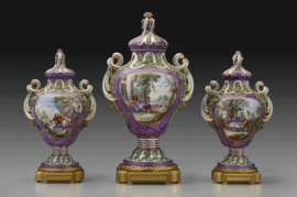 И вот нам подарена возможность увидеть причудливой формы - разумеется, как и всё, что собирал Фрик, только ручной работы - похожую на плывущий по волнам корабль вазу и две, тончайшим рисунком изумляющие вазочки, изготовленные в 1759 году; удивительного изящества попурри трёх ваз 1762 года; украшенный цветами и птицами маленький сервиз 1767 года; кувшин и чашу для умывания с виртуозно выполненным пейзажем...