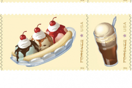 Буклет из двадцати марок под названием Soda Fountain Favorites и номиналом Forever (текущая стоимость постового отправления весом в одну унцию) содержит пять оригинальных изображений: вафельный конус с двумя шариками мороженого (double-scoop ice cream cone), яичный крем (egg creme), банановый сплит (banana split), корневое пиво (root beer float) и сандей с горячим шоколадом (hot fudge sundae).