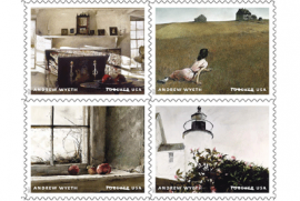 Почтовая служба США выпустила двенадцать новых марок в честь 100-летия известного художника, рисовавшего в жанре магический реализм (magicrealism), Эндрю Уайета (1917 - 2009). На своих картинах он изображал преимущественно дикую природу Северной Америки, а также быт жителей глубинки. Буклет под названием Andrew Wyeth Forever Stamp уже поступил в продажу. Номинал каждой марки - Forever (текущая стоимость письма весом в одну унцию - 49 центов).