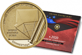 21 июля Монетный двор США (US Mint) начнёт продажу новой монеты в рамках серии Американские инновации (American Innovation). Очередной коллекционный доллар будет посвящён штату Коннектикут и усовершенствованной логарифмической линейке Джозефа Гербера (Joseph Gerber Variable Scale).