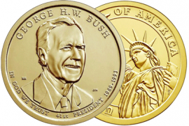 Металлический доллар с изображением 41-го президента США (1989 - 1993) Джорджа Буша-старшего (George H. W. Bush) поступит в обращение 4 декабря. Монета станет 40-й по счёту в популярной серии Presidential Dollar Coins (с февраля 2007 года).