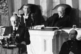 Фото: Рузвельт выступает с речью в Конгрессе. За ним сидят вице-президент Генри А. Уоллес (слева) и спикер Палаты представителей Сэм Рейберн (справа). Правее Рузвельта сидит сын президента — Джеймс Рузвельт, сопровождавший своего отца в Капитолий и служивший офицером в морской пехоте. Общественное достояние