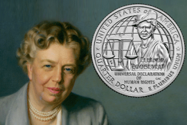 На монете Рузвельт стоит рядом с весами правосудия (scales of justice) и держит в руках земной шар с надписью Всеобщая декларация прав человека (Universal Declaration of Human Rights). Именно такой Элеонор запомнилась своим современникам, которые ценили её за гражданский активизм, дипломатию и защиту прав человека. Её личность в полной мере соответствует известному высказыванию о том, что в тени каждого великого мужчины находится великая женщина.
