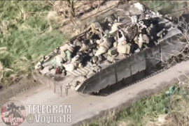 Фото: “Мясная защита”. Мёртвые оккупанты катаются на броне уцелевшей после удара дрона-камикадзе БМП-1. Стоп-кадр YouTube