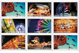 Почтовая служба США (USPS) выпустила серию марок Carnival Nights. На 10 оригинальных марках увековечено одно из старейших американских развлечений - ночные карнавалы. На картинках изображены аттракционы, колесо обозрения, фейерверки, гирлянды и другие атрибуты ночных карнавалов.