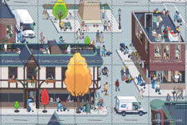 Новый релиз имеет необычный дизайн: 20 разных марок являются частичками картины большого американского города. На большой картинке можно увидеть несколько грузовиков USPS, почтальонов, радостных получателей посылок.