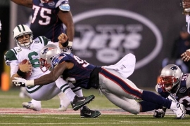 Подпись к фото: Марк Санчез (NY Jets) обрушивается на игрока New England Patriots Андре Картера