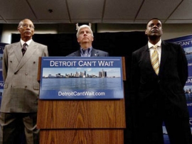 Подпись к фото: Мэр Детройта Дейв Бинг, слева, губернатор Рик Снайдер и Кевин Д. Орр отвечают на вопросы на конференции для прессы. AP Photo/Paul Sancya
