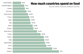 В целом, американцы тратят на еду меньше всех на планете. За ними с показателем 9.1% следуют англичане, а потом канадцы (9.6%), немцы (10.9%) и южнокорейцы (12.2%).
