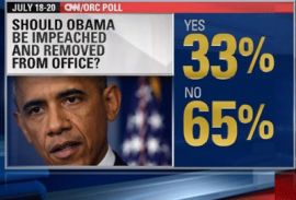 Последний опрос телекомпании CNN показал, что примерно треть американцев хотят, чтобы президент Барак Обама был подвергнут импичменту за постоянное превышение конституционных полномочий. В общем, согласно опросу, 33% американцев хотят импичмента.