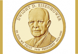 Республиканец Эйзенхауэр считается одним из лучших президентов в истории Соединённых Штатов. Он окончил знаменитую нью-йоркскую академию Вест-Пойнт и в годы Второй мировой войны дослужился до генерала. Блестящая военная карьеры и незапятнанная репутация помогли ему без особых проблем победить на выборах. Он вступил в должность 34-го президента США 20 января 1953 года, сменив Гарри Трумана (о долларе с его изображением «РБ» рассказывал в начале января). Его преемником стал Джон Кеннеди.