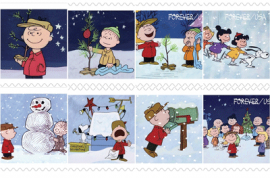 Почтовая служба США (USPS) выпустила серию марок в честь классического мультфильма «Рождество Чарльза Брауна» (A Charlie Brown Christmas), который вышел на телевизионные экраны 50 лет назад.