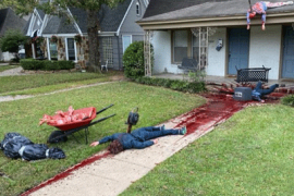 Вместо стандартных тыкв, пауков и летучих мышей он разложил на территории окровавленные трупы.