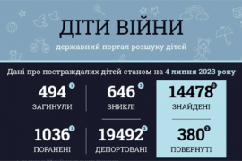 По данным ювенальных прокуроров Украины, в результате российского вторжения в Украине погибли 494 ребенка, ранения разной степени тяжести получили еще не менее 1036 детей.