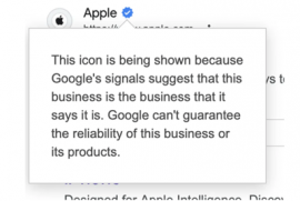 При наведении курсора на галочку отобразится сообщение, в котором объясняется, что «сигналы Google указывают на то, что эта компания является именно той, за которую она себя выдает». По словам Шахина, это определяется такими факторами, как проверка веб-сайта, данные Merchant Center и ручные проверки.