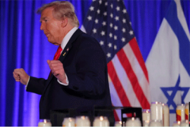 Дональд Трамп присоединился к членам еврейской общины в своем гольф-клубе Doral во Флоридена мероприятии, которое его избирательная кампания назвала «мемориальным» - в честь тех, кто был убит и взят в заложники боевиками ХАМАС в ходе ужасающего нападения на Израиль ровно год назад.