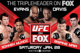 Промоутерская компания UFC (Ultimate Fighting Championship) и телеканал Fox порадуют любителей боёв без правил очередной бесплатной трансляцией. Вечером 28 января в рамках турнира сойдутся англичанин Майкл Биспинг и бразилец Дэмиан Майя, американцы Чаэл Зоннен и Марк Мунос, Рашад Эванс и Фил Дэвис.