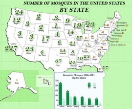 По данным исследования, проведенного Институтом по изучению религии Hartford Institute, в 2010-м году в Соединенных Штатах было 2106 мечетей, по сравнению с 1209 десятью годами раньше. Опрос, проведенный в 2011-м году Форумом Пью по религии и общественной жизни (Pew Forum on Religion & Public Life), сообщает, что сейчас в стране проживает 2 миллиона 750 тысяч мусульман.